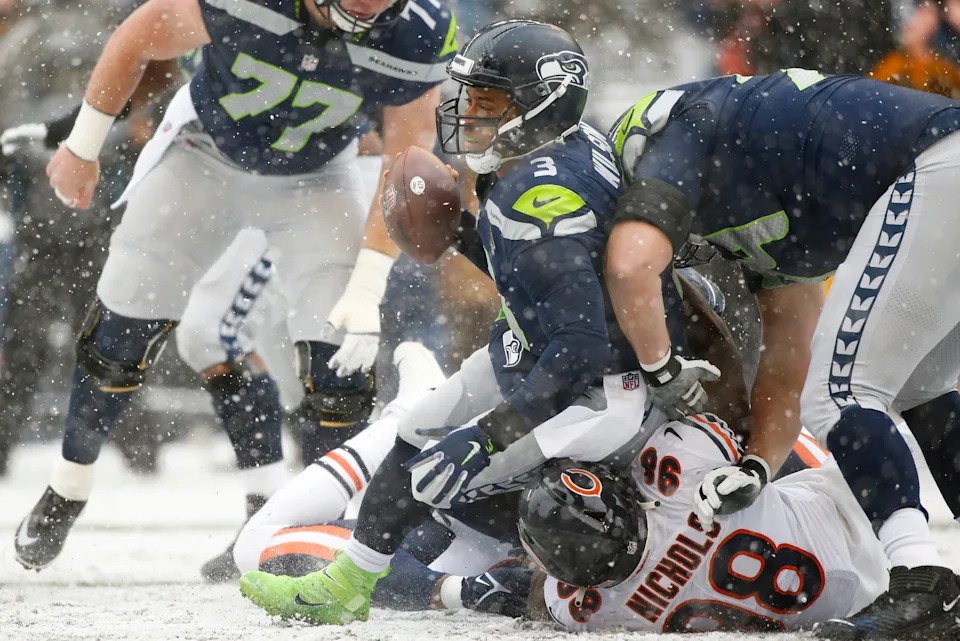 Dec. 26, 2021: Seattle Seahawks quarterback Russell Wilson (3) is sacked by Chicago Bears defensive end Bilal Nichols (98) during the first quarter at snowy Lumen Field. The Bears won the game, 25-24.