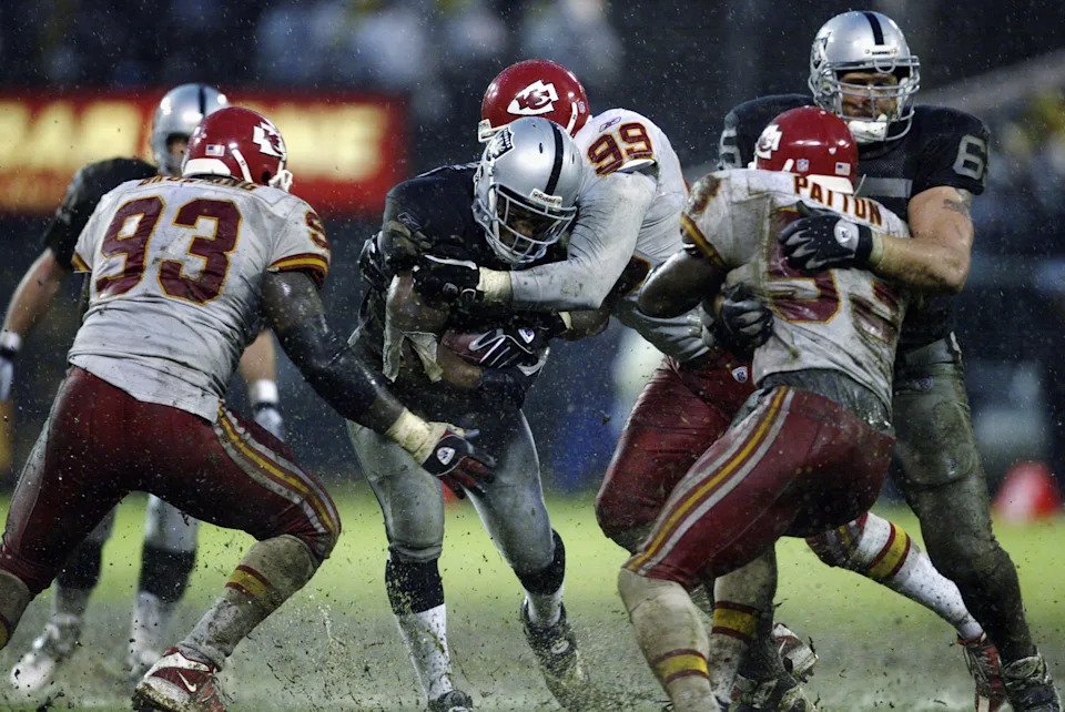 Dec. 28, 2002: Oakland Raiders running back Zack Crockett (32) is tackled by the Kansas City Chiefs’ Duane Clemons (99) during a game at the Network Associates Coliseum in Oakland, California. The Raiders won the game, 24-0.