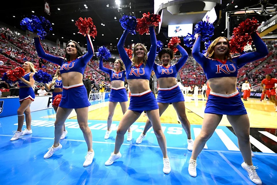 Kansas Jayhawks cheerleaders perform before a second round game of the men’s 2026 NCAA Tournament against the St. John’s Red Storm at Viejas Arena on March 22, 2026 in San Diego, Calif.