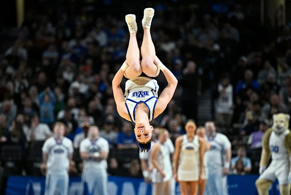 BYU Cougars cheerleader in the second half against the Texas Longhorns during a first round game of the men’s 2026 NCAA Tournament at Moda Center on Mar 19, 2026 in Portland, Ore.