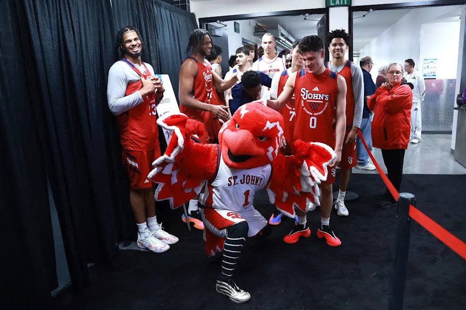 St. John’s Red Storm mascot Johnny Thunder mixes with players prior to taking the court during practice day ahead of the NCAA Men’s Basketball Tournament at Viejas Arena at San Diego State University on March 19, 2026 in San Diego, California.