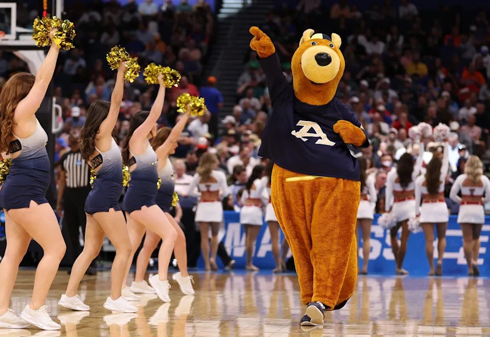 Akron Zips cheerleaders and mascot in the second half against the Texas Tech Red Raiders during a first round game of the men’s 2026 NCAA Tournament at Benchmark International Arena on March 20, 2026 in Tampa, Fla.