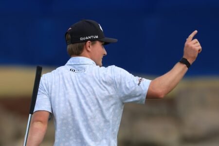 DUBAI, UNITED ARAB EMIRATES – JANUARY 24: Andy Sullivan of England plays his second shot on the 18th hole during day three of the Hero Dubai Desert Classic 2026 at Emirates Golf Club on January 24, 2026 in Dubai, United Arab Emirates. (Photo by Andrew Redington/Getty Images)