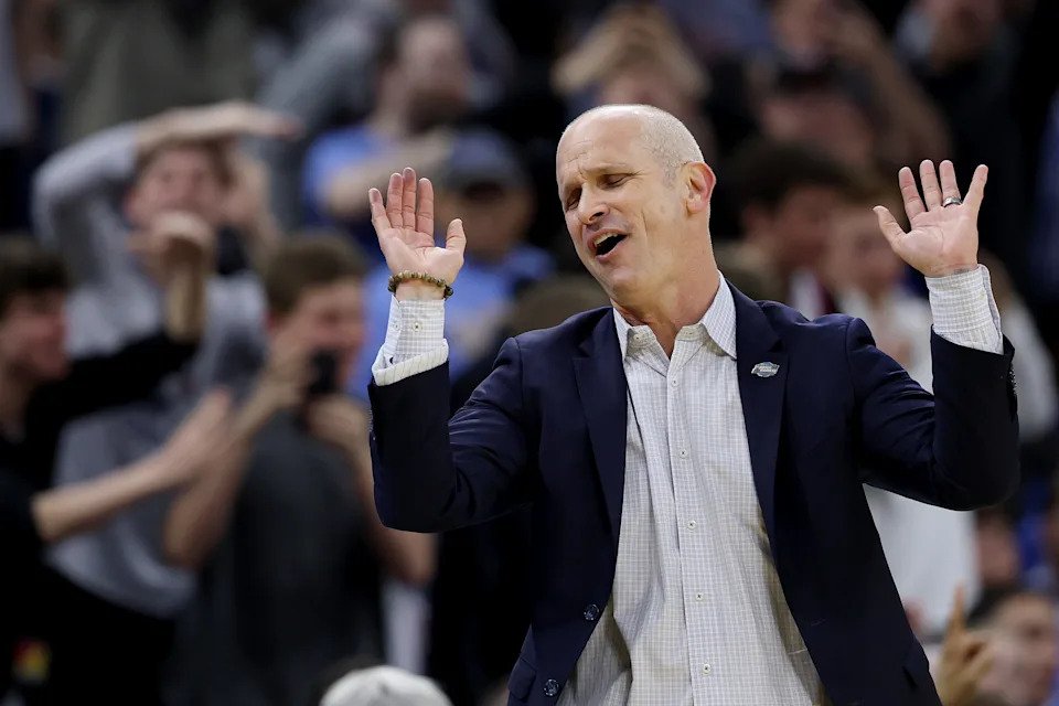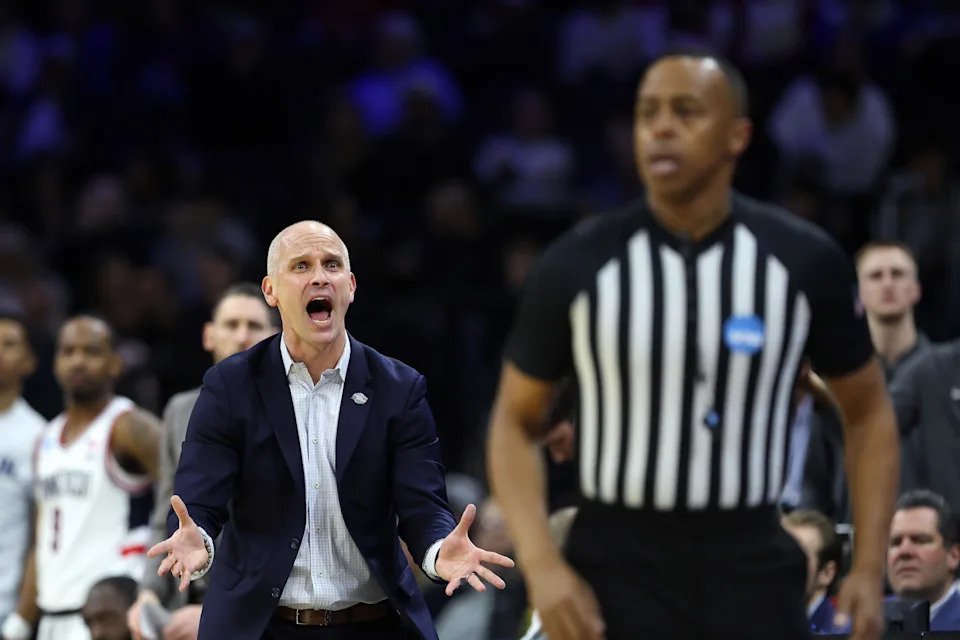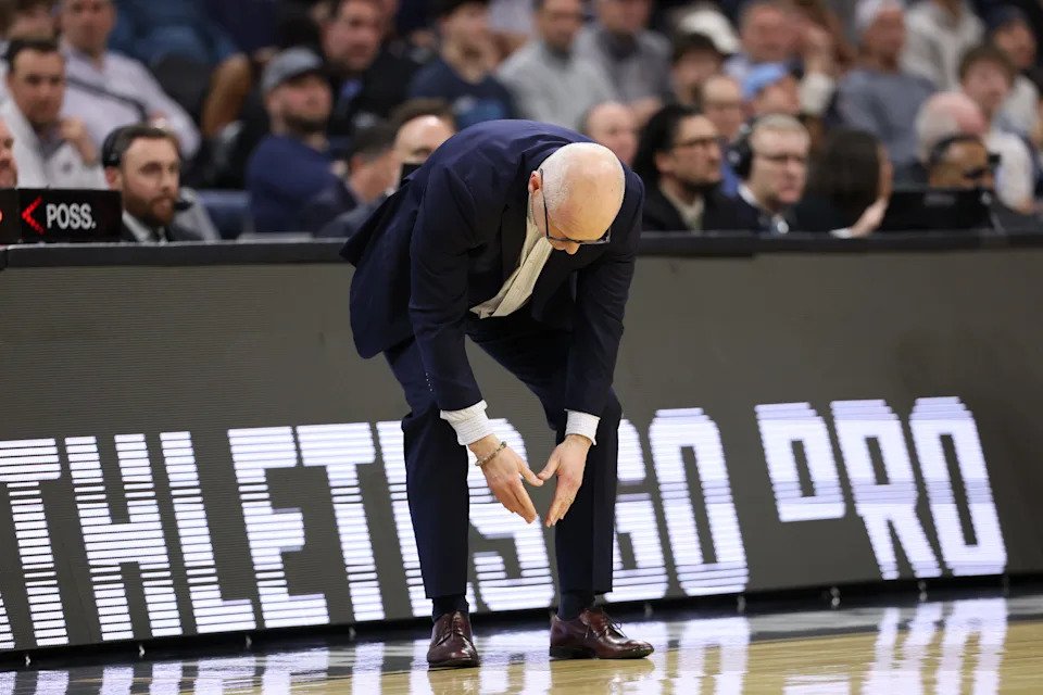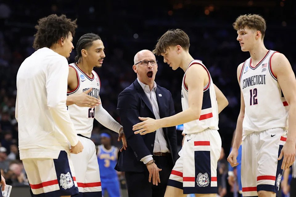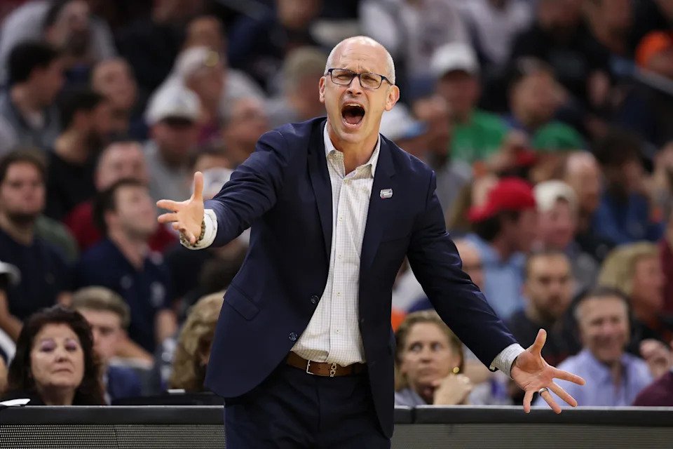 PHILADELPHIA, PENNSYLVANIA – MARCH 20: Head coach Dan Hurley of the UConn Huskies reacts against the Furman Paladins during the second half in the first round of the 2026 NCAA Men’s Basketball Tournament at Xfinity Mobile Arena on March 20, 2026 in Philadelphia, Pennsylvania. (Photo by Emilee Chinn/Getty Images)