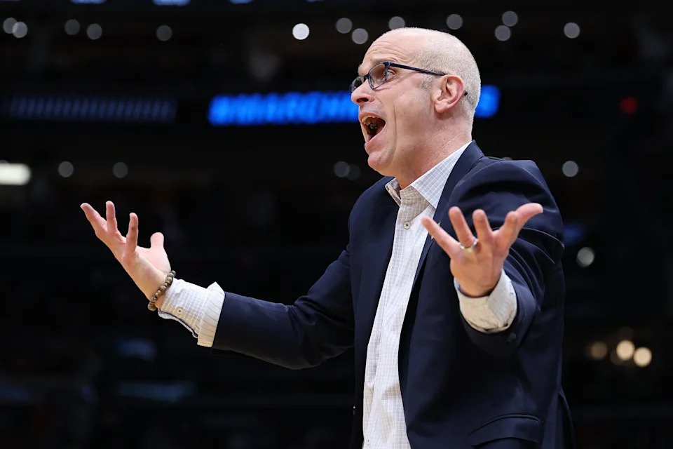 WASHINGTON, DC – MARCH 27: Head coach Dan Hurley of the UConn Huskies reacts during the second half against the Michigan State Spartans in the Sweet Sixteen of the 2026 NCAA Men’s Basketball Tournament at Capital One Arena on March 27, 2026 in Washington, DC. (Photo by Emilee Chinn/Getty Images)