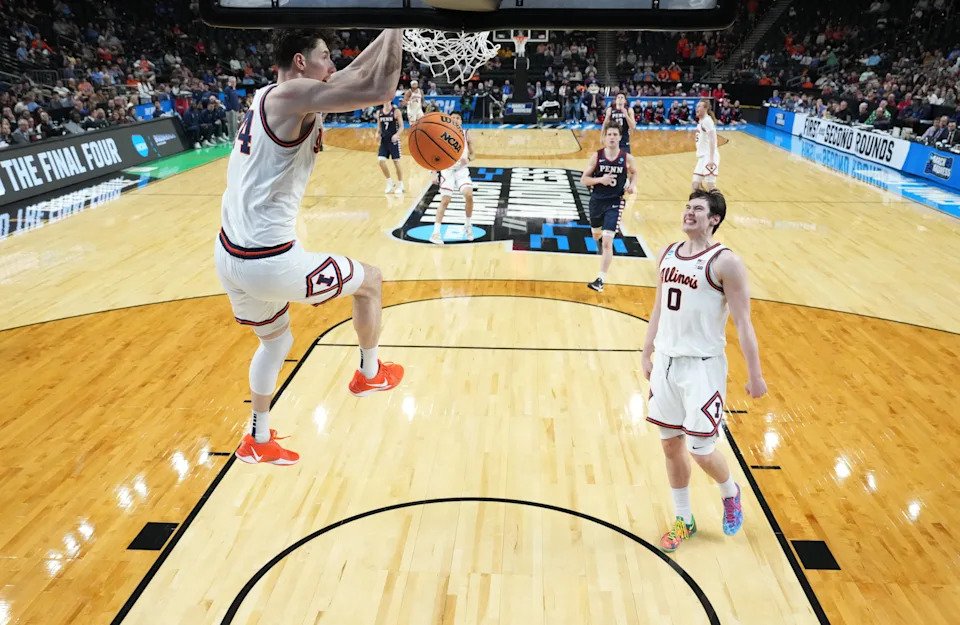 Illinois Fighting Illini center Zvonimir Ivisic (44) dunks the ball against the Penn Quakers in the second half of a first round game of the men’s 2026 NCAA Tournament at Bon Secours Wellness Arena.