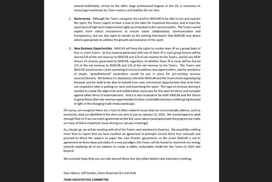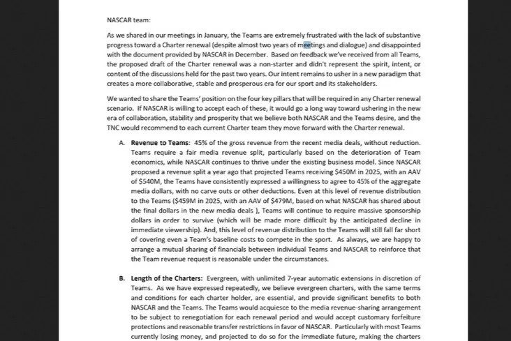 Much of what was said and done over the three years of negotiations has been retroactively documented as part of fact discovery. Most of the back-and-forth, naturally, came down to money and what percentage of revenue charter holding teams would receive after NASCAR completed its current broadcast rights agreement with FOX, NBC, Turner Sports, and Amazon Prime.