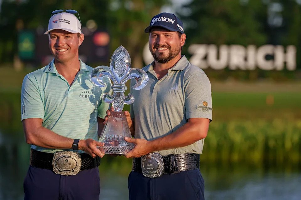 April 27: Ben Griffin (left) celebrates with teammate Andrew Novak after winning the Zurich Classic of New Orleans golf tournament.