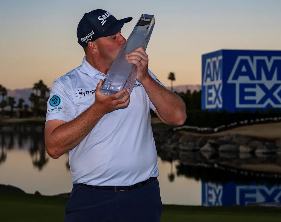 Jan. 19: Sepp Straka celebrates after winning The American Express on the Pete Dye Stadium Course at PGA West in La Quinta, California.