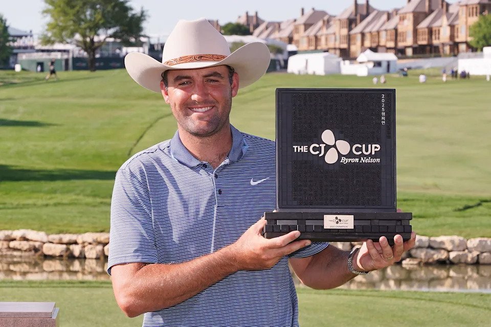 May 4: Scottie Scheffler poses with the winner’s trophy after the final round of the CJ Cup Byron Nelson golf tournament. Scheffler won with a score of 31-under par for the tournament.