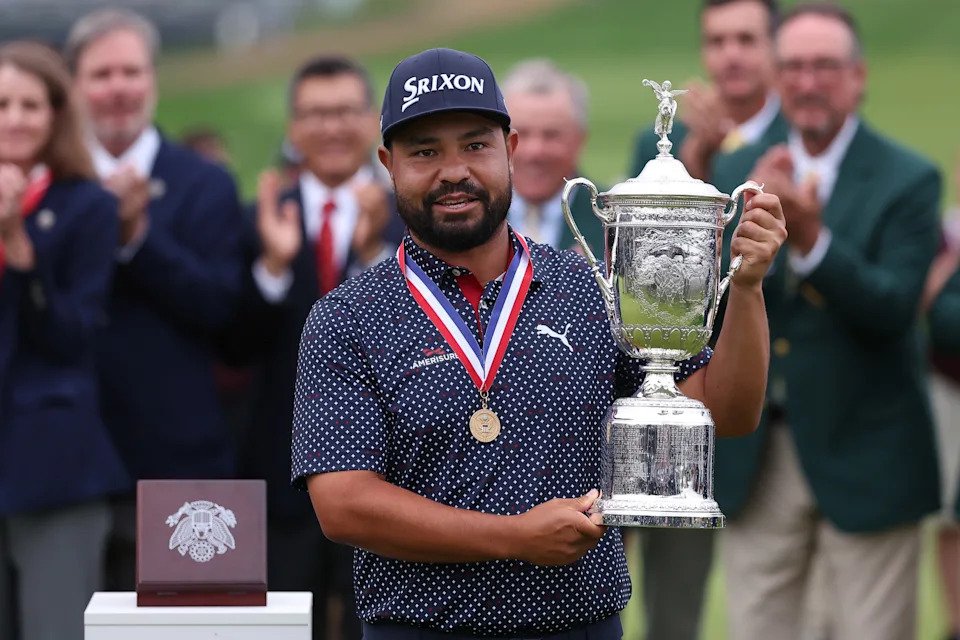 June 15: J.J. Spaun celebrates with the championship trophy after winning the 125th U.S. Open at Oakmont Country Club in Pennsylvania.
