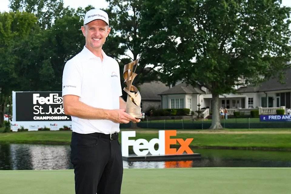 Aug. 10: Justin Rose poses with the winner’s trophy after the final round of the FedEx St. Jude Championship at TPC Southwind in Memphis, Tennessee.