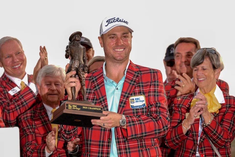 April 20: Justin Thomas holds his trophy and wears the plaid jacket after winning the RBC Heritage golf tournament at Harbour Town Golf Links in Hilton Head, South Carolina