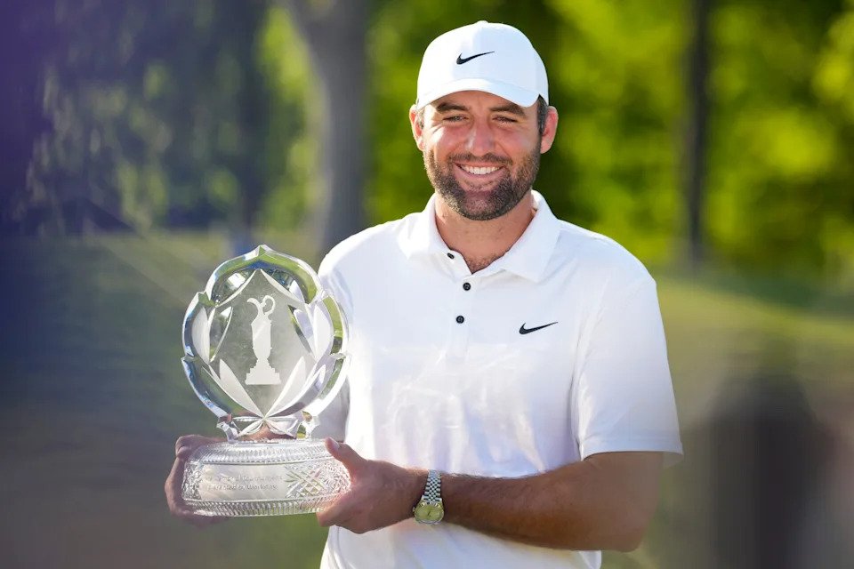 June 1: Scottie Scheffler poses for photos with the tournament trophy after winning the Memorial Tournament at Muirfield Village Golf Club in Dublin, Ohio.