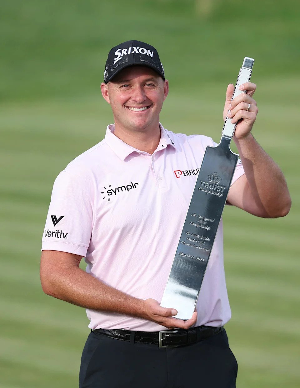 May 11: Sepp Straka poses for a photo with the championship trophy after winning the Truist Championship golf tournament at Philadelphia Cricket Club.