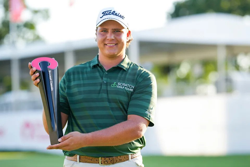 June 29: Aldrich Potgieter poses for photos with the trophy after winning the Rocket Mortgage Classic at Detroit Golf Club.