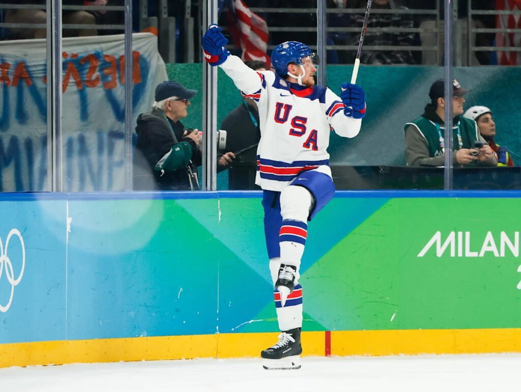 PHOTO CAPTION: Jack Eichel (9) of the United States celebrates after scoring a goal during the second period against Slovakia in a men’s ice hockey semifinal during the Milano Cortina 2026 Olympic Winter Games at Milano Santagiulia Ice Hockey Arena.