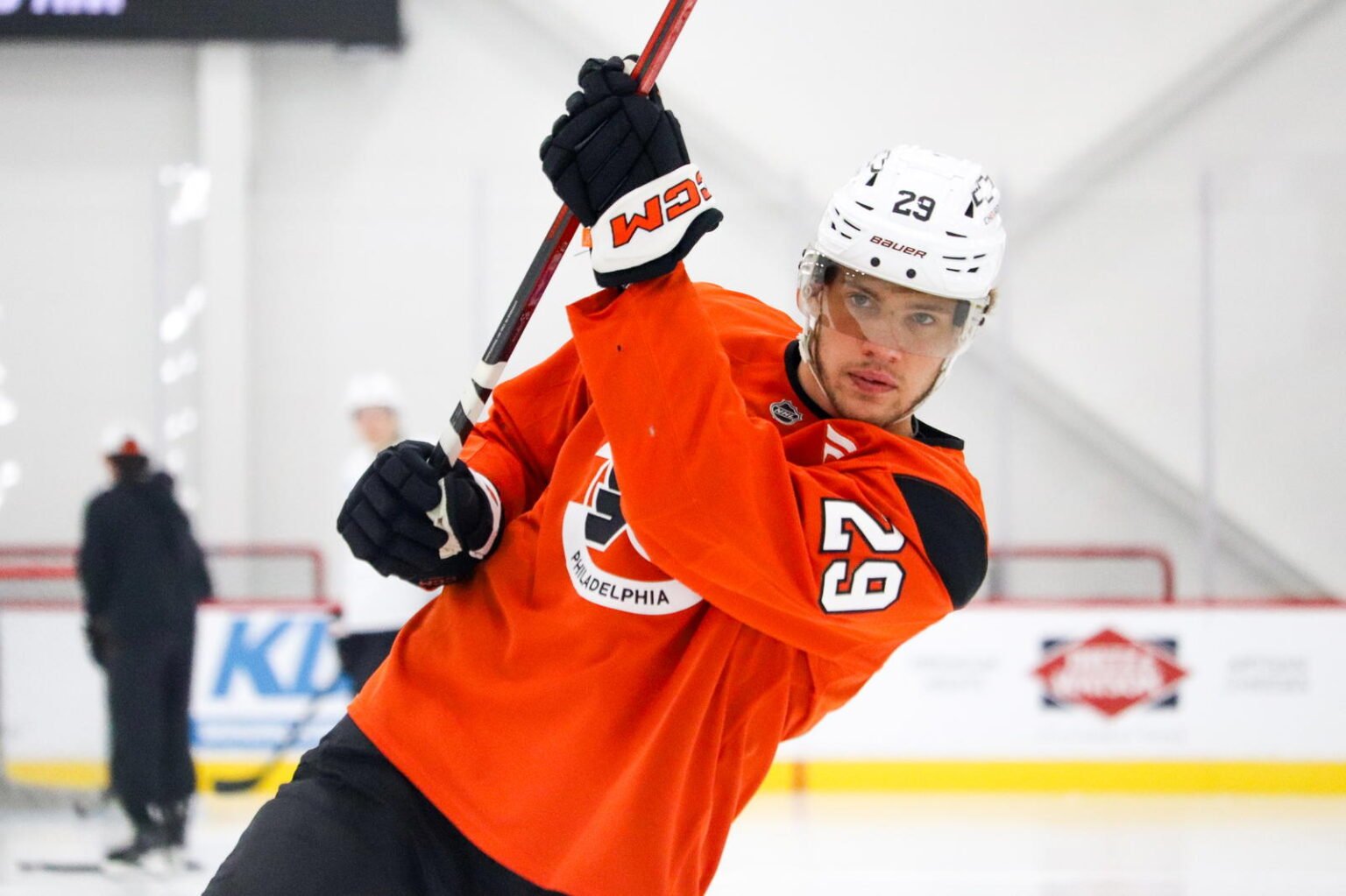 It’s the kind of pairing that fans dream about because it hints at highlight-reel chemistry. But the real intrigue came with the third piece of the line—Grebenkin, a prospect who has been making noise at camp and suddenly found himself flanking two of the Flyers’ brightest stars.