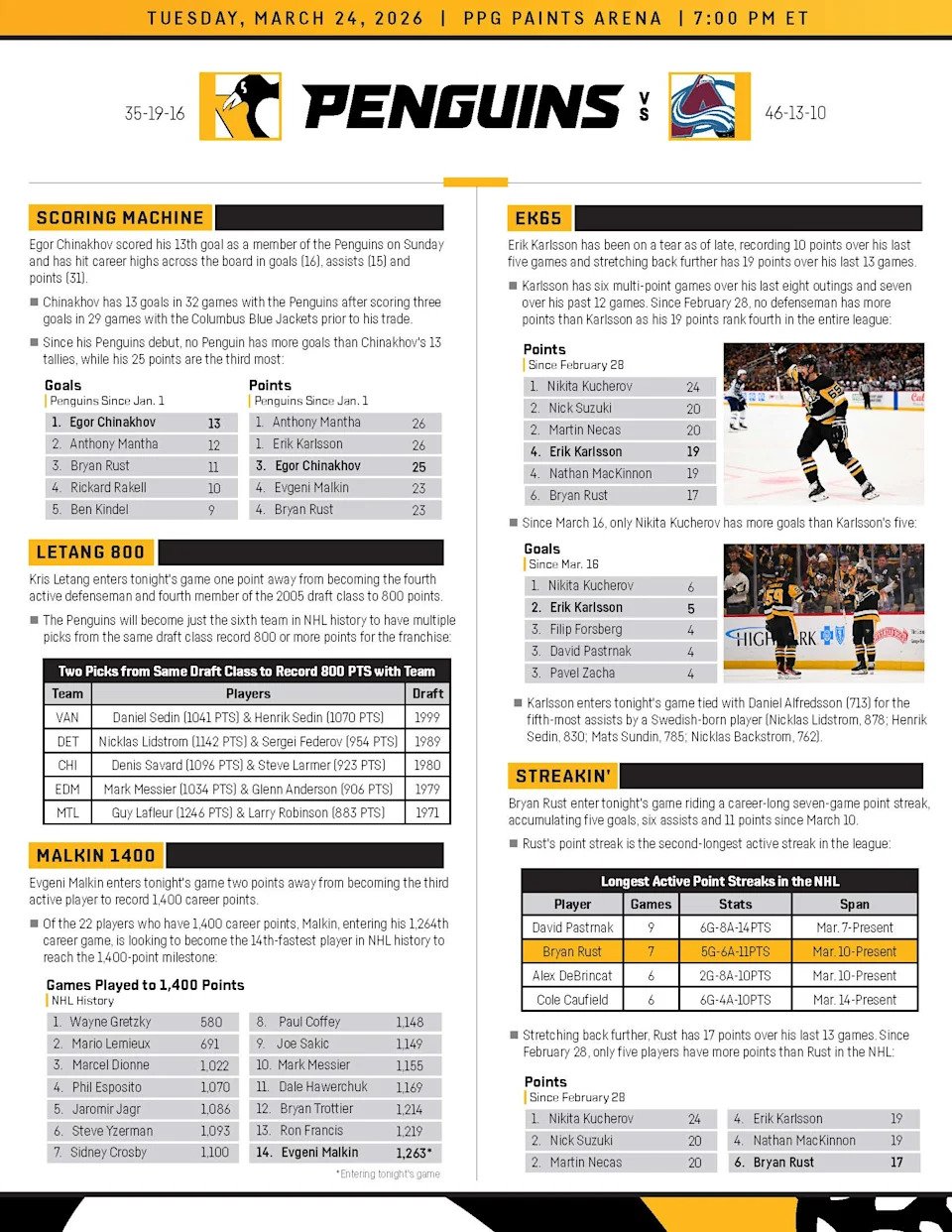 Pens’ Path Ahead: The Penguins are hitting the road to play the Ottawa Senators on Thursday night before returning home for a matchup with the Dallas Stars on Saturday. Then comes a back-to-back set with major Eastern Conference playoff race implications as the Penguins take on the New York Islanders on the road Monday 3/30 and the Detroit Red Wings at home the following day.
