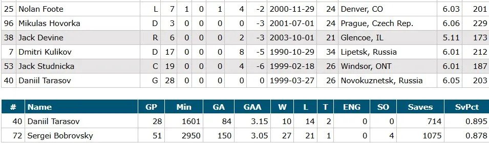 Goalies: Sergei Bobrovsky and Daniil Tarasov