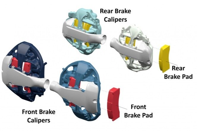 The split brake pads act almost like a customized suspension in order to allow handling to be equalized across unique corners in conjunction with the brake bias adjustment that the drivers have in the car which allows them to shift brake pressure from front to rear on the fly.