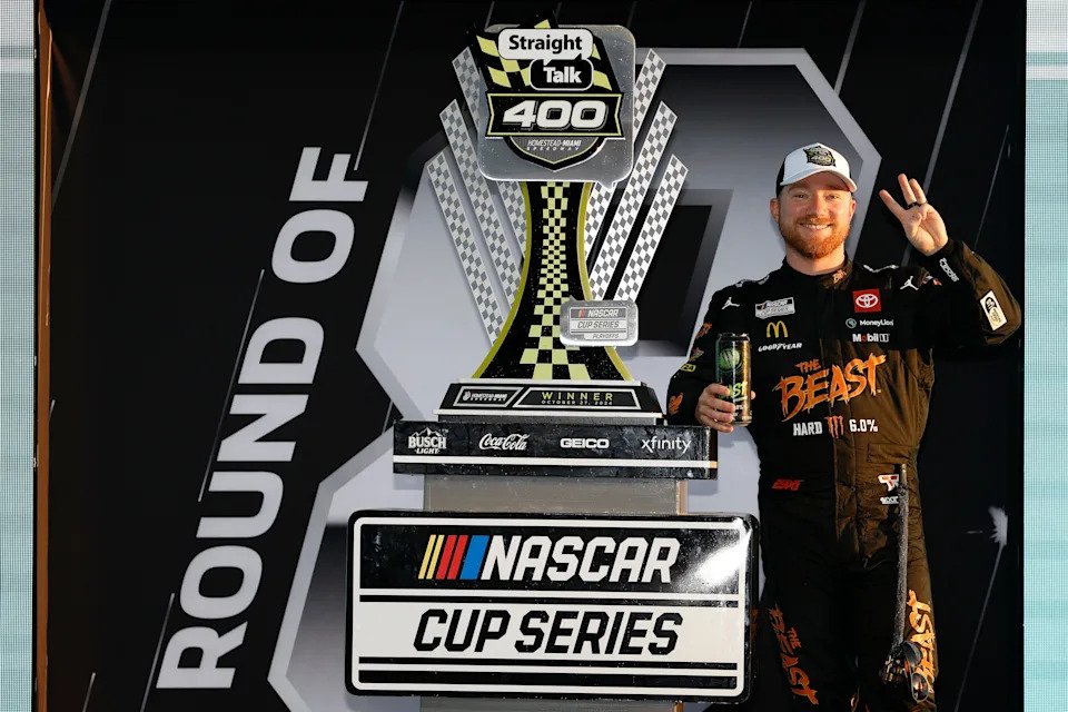 Oct. 27: Tyler Reddick celebrates after winning the Straight Talk Wireless 400 NASCAR Cup Series playoff race at Homestead-Miami Speedway.