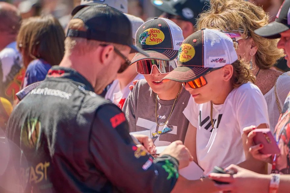 Mar 12, 2023; Avondale, AZ, USA; NASCAR Cup Series driver Tyler Reddick (45) signs memorabilia for race fans while walking the red carpet for the United Rentals Work United 500 at Phoenix Raceway in Avondale on March 12, 2023. Mandatory Credit: Alex Gould/The Republic
