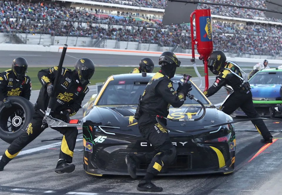 Pit crewmen hurry as they service the Tyler Reddick’s no. 45 Toyota, Monday February 19, 2024 during the Daytona 500.