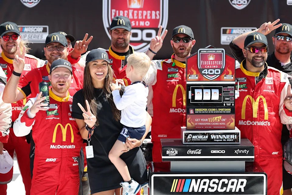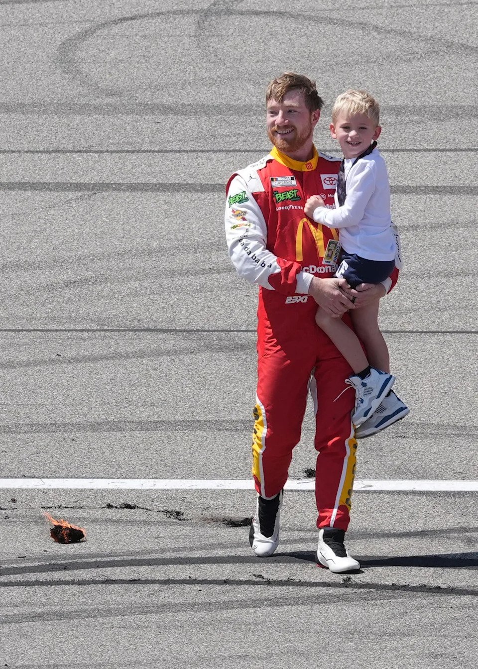 Tyler Reddick carries his son Beau on the track after winning the FireKeepers Casino 400 at Michigan International Speedway.