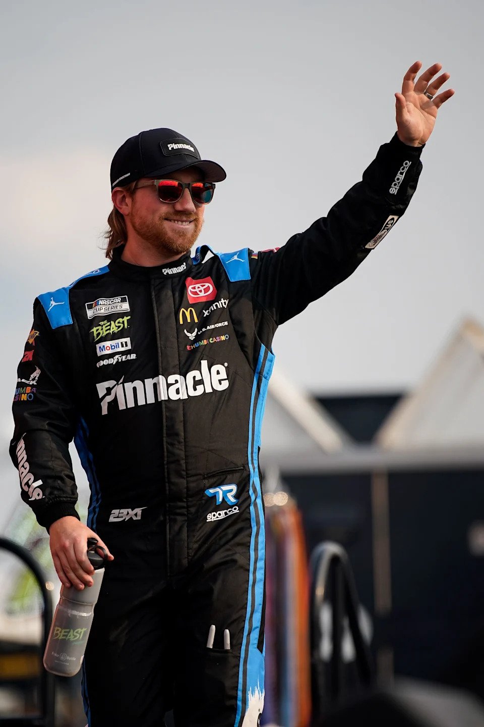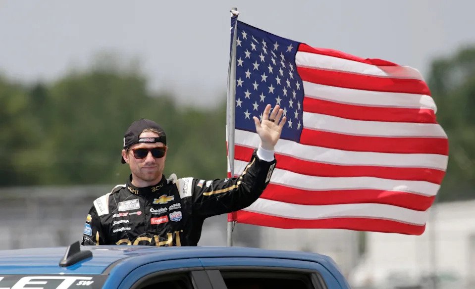 Tyler Reddick (8) waves from a truck before the NASCAR Kwik Trip 250, Sunday, July 3, 2022, at Elkhart Lake’s Road America near Elkhart Lake, Wis.