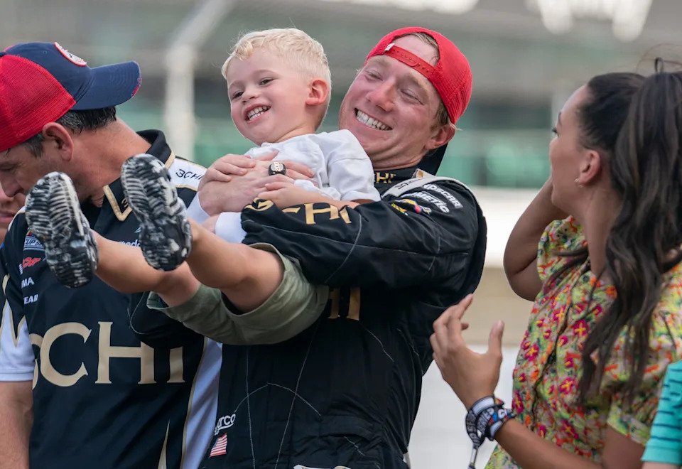 NASCAR Cup Series driver Tyler Reddick (8) swings his son Beau Reddick. after winning the Verizon 200 at the Brickyard, Indianapolis Motor Speedway, Sunday, July 31, 2022.