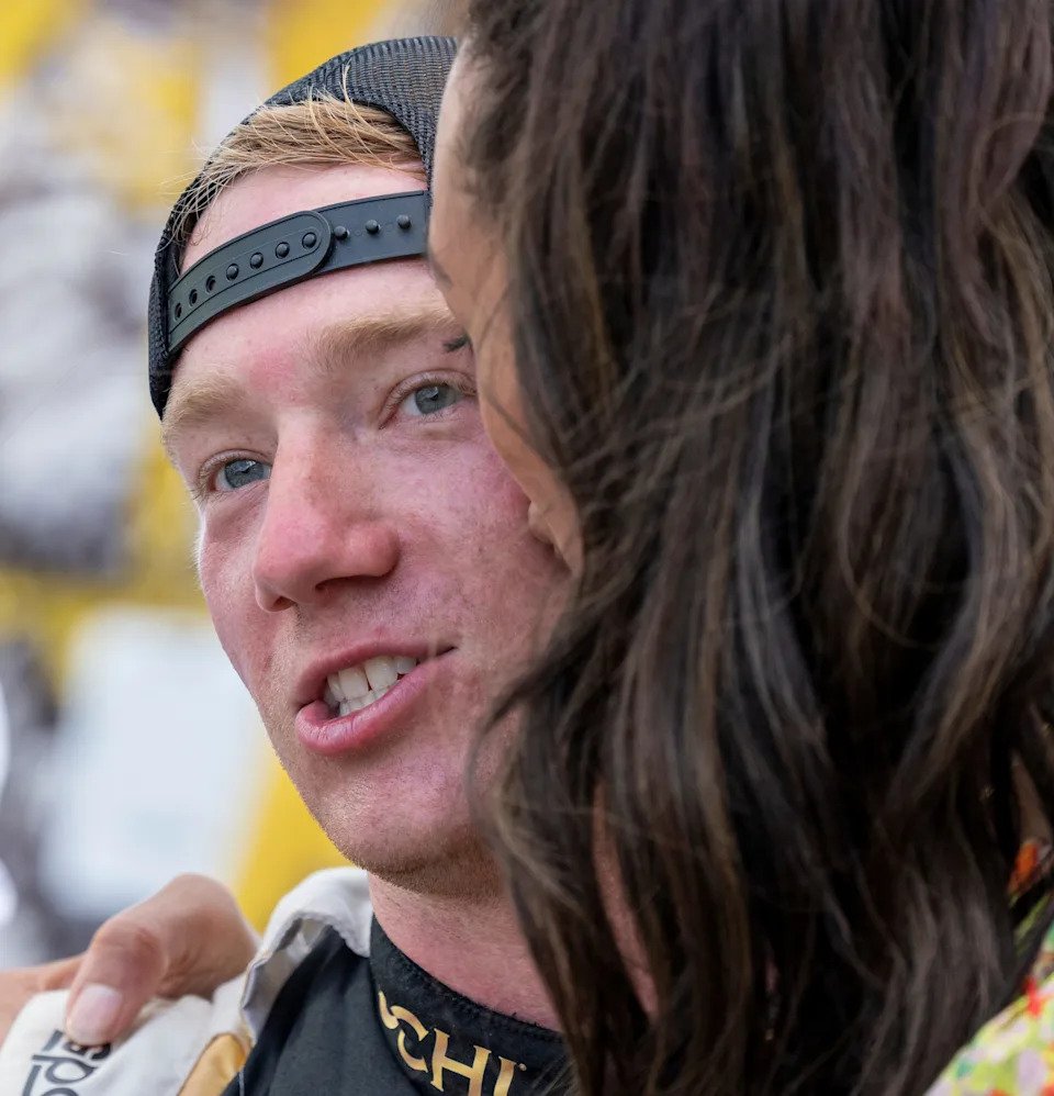 NASCAR Cup Series driver Tyler Reddick (8) gets a kiss from his wife Alexa De Leon, after winning the Verizon 200 at the Brickyard, Indianapolis Motor Speedway, Sunday, July 31, 2022.