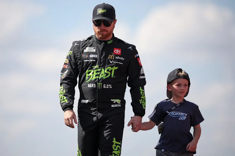 AUSTIN, TEXAS – MARCH 02: Tyler Reddick, driver of the #45 The Beast Toyota, and son, Beau Reddick walk onstage during driver intros prior to the NASCAR Cup Series EchoPark Automotive Grand Prix at Circuit of The Americas on March 02, 2025 in Austin, Texas. (Photo by James Gilbert/Getty Images)