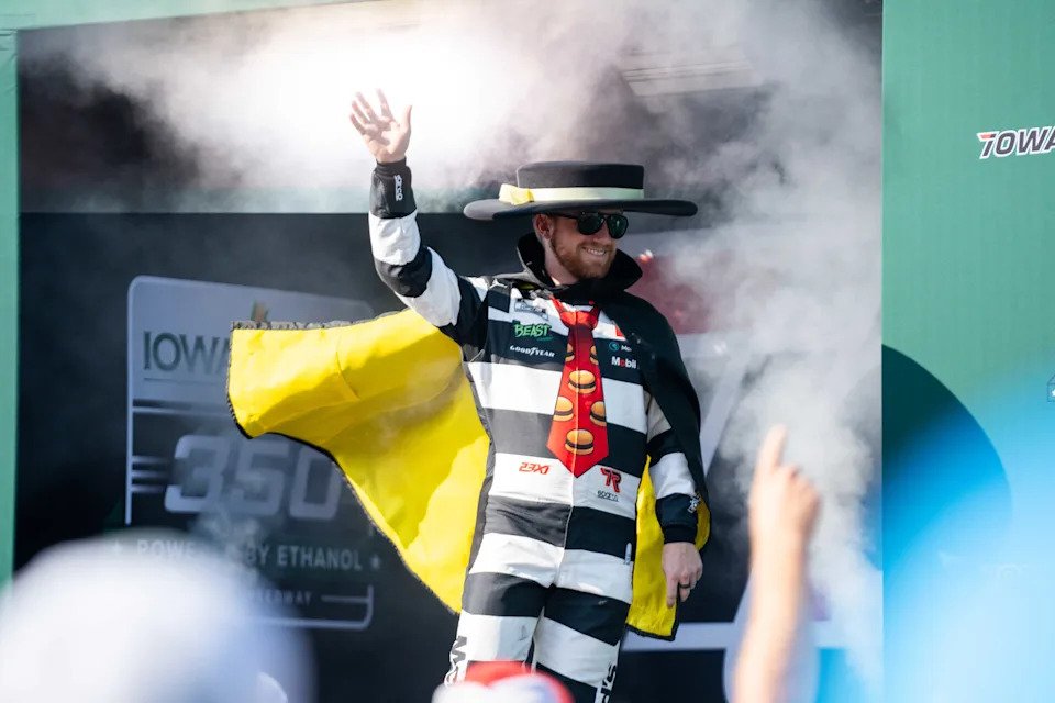 NASCAR Cup Series driver Tyler Reddick (45) is introduced wearing a Hamburglar costume on Sunday, June 16, 2024, at the Iowa Speedway in Newton.