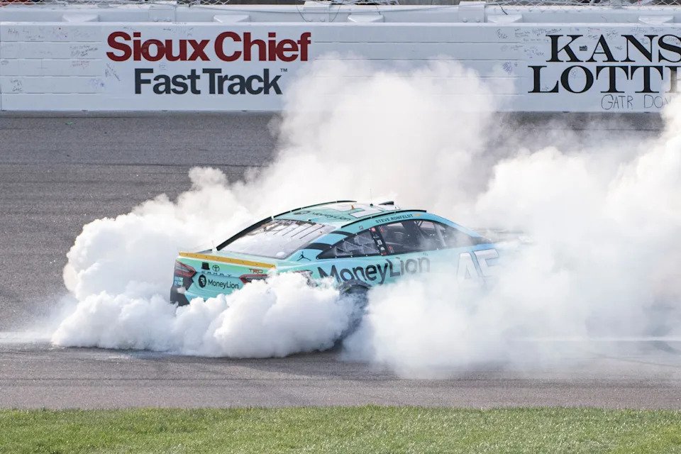 Tyler Reddick does a burnout after winning the NASCAR Cup Series playoff race at Kansas Speedway.