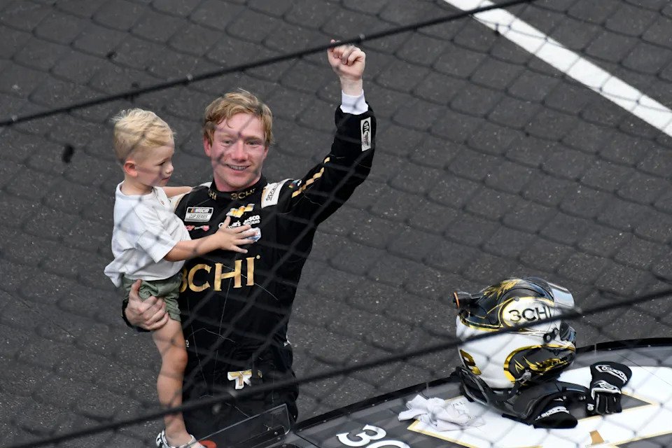 NASCAR Cup Series driver Tyler Reddick (8) holds up his son, Beau, on Sunday, July 31, 2022, after winning the Verizon 200 at the Brickyard at Indianapolis Motor Speedway.