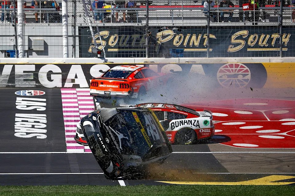 LAS VEGAS, NEVADA – OCTOBER 20: Tyler Reddick, driver of the #45 Jordan Brand Toyota, flips after an on-track incident during the NASCAR Cup Series South Point 400 at Las Vegas Motor Speedway on October 20, 2024 in Las Vegas, Nevada. (Photo by Sean Gardner/Getty Images)