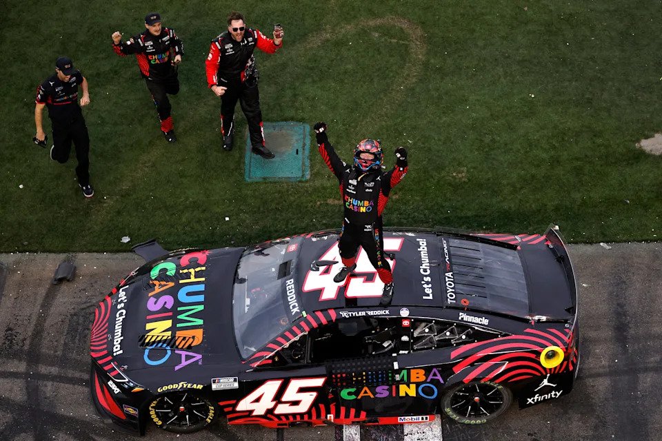 DAYTONA BEACH, FLORIDA – FEBRUARY 15: Tyler Reddick, driver of the #45 Chumba Casino Toyota, celebrates after winning the NASCAR Cup Series Daytona 500 at Daytona International Speedway on February 15, 2026 in Daytona Beach, Florida. (Photo by Sean Gardner/Getty Images)