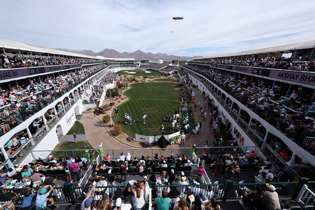 SCOTTSDALE, Ariz. – It is the place to be at the WM Phoenix Open, and the line proves it. The human chain snakes around the back of the immense temporary arena surrounding the par-3 16th hole at TPC Scottsdale and remains unbroken as it extends between the towering grandstands and the 11th fairway. Few people have more than one free hand and many have none—one paw clutching a phone, the other a beverage that is intended for something other than refreshment.