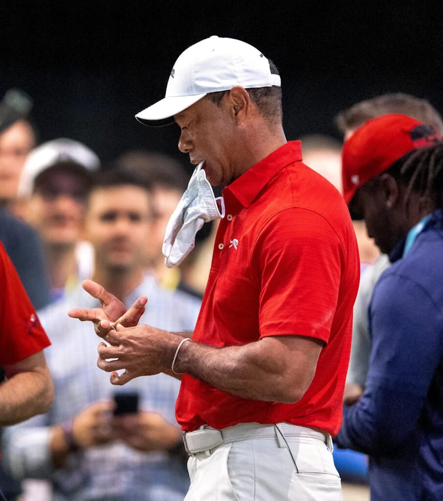 Tiger Woods of Jupiter Links GC tapes his fingers during warm ups before match against the Los Angeles Golf Club who won the TGL finals at SoFi Center on March 24, 2026, in Palm Beach Gardens, Florida.