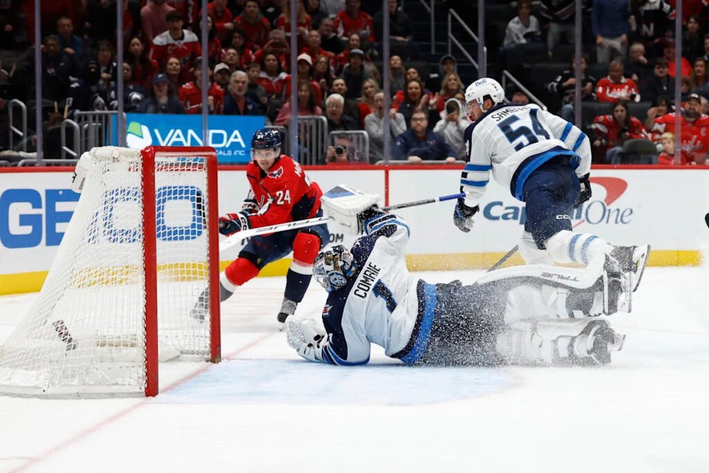 Jets defense prospect Elias Salomonsson made his NHL debut and had his moments, but one he’d like to forget came on the Caps fourth goal. A puck skipped past him at the blue line, allowing Connor McMichael to race free for a breakaway that he converted to make it 4–2 for Washington.
