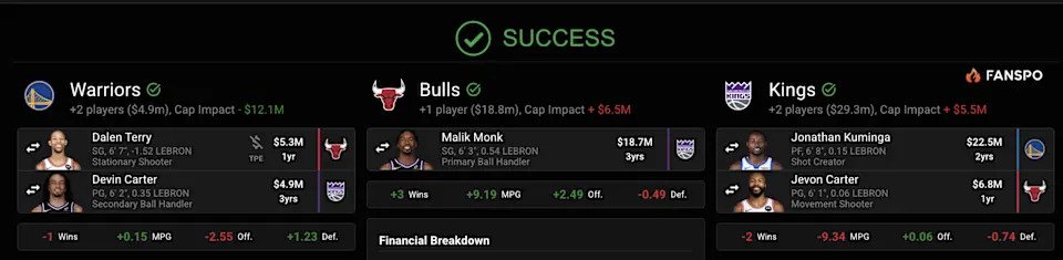 The Kings have consistently been mentioned as Kuminga’s biggest suitor, but Golden State’s hesitance to take on Malik Monk’s long-term money has killed the deal to this point. In this three-team trade, the Chicago Bulls jump in to take Monk, clearing the way for Kuminga to Sacramento. The Warriors are getting a pair of failed first-round picks in this deal with Devin Carer and Dalen Terry. Terry is a pretty good wing defender who can’t do much on offense, and he expires after this season. Carter is in his second season, and the 3-and-D skill set that made him a lottery pick coming out of college has yet to translate. Maybe the Warriors think they can resurrect Carter’s career, while the Bulls land a microwave scoring guard that allows them to trade Coby White before they would have to re-sign him this summer.