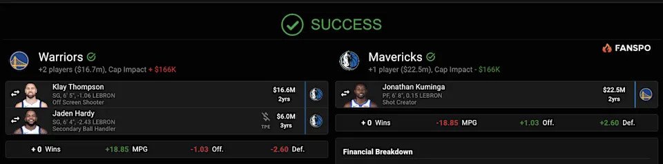 The Mavs reportedly have interest in Kuminga, and I could help myself but use that as an excuse to send Klay Thompson back to the Bay. Golden State might not love Thompson having another season at $16 million on the books after this year, but maybe they could trade him again this summer for a piece that fits better. There’s always a chance Thompson can catch fire and swing a playoff game again for Golden State, and that’s just fun to think about. I don’t see much downside here for either team.