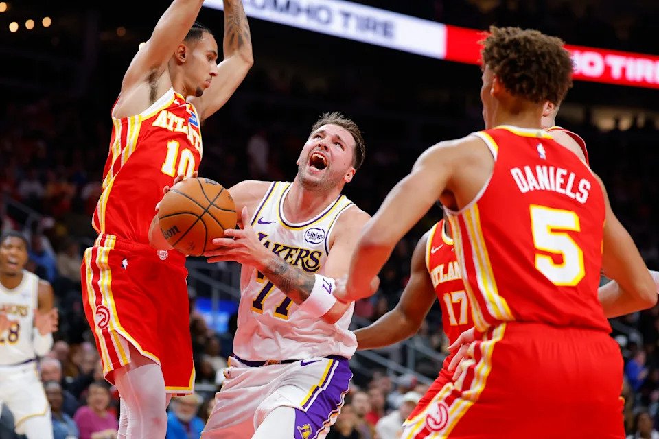 Luka Doncic #77 of the Los Angeles Lakers is fouled during the first quarter against the Atlanta Hawks at State Farm Arena on November 8, 2025 in Atlanta, Georgia.