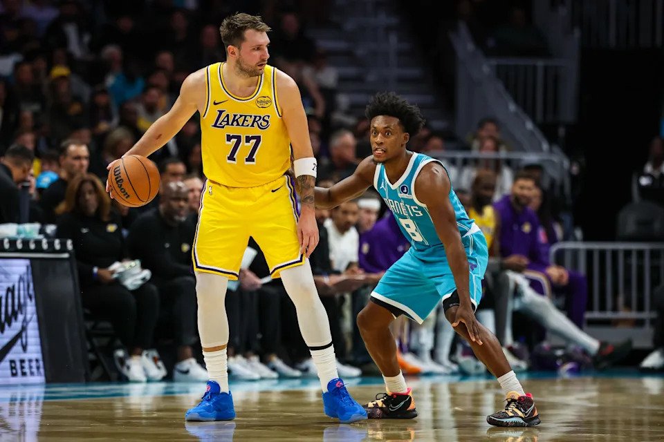 Collin Sexton #8 of the Charlotte Hornets defends Luka Doncic #77 of the Los Angeles Lakers during the first half of the basketball game at Spectrum Center on November 10, 2025 in Charlotte, North Carolina.