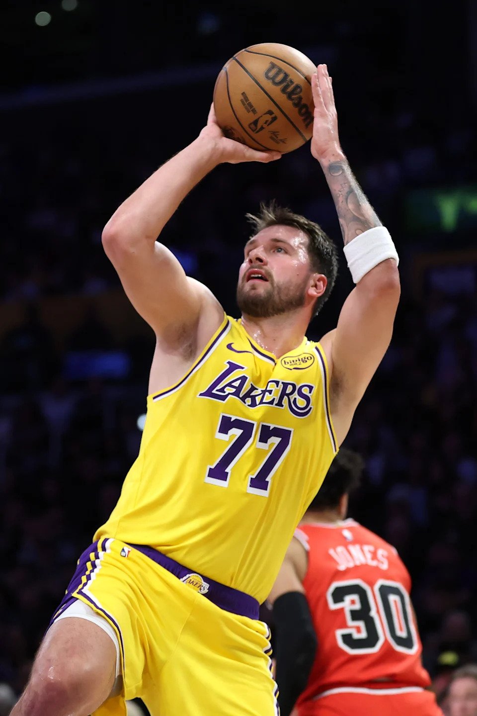 Luka Doncic #77 of the Los Angeles Lakers shoots from the outside during the first half of a game against the Chicago Bulls at Crypto.com Arena on March 12, 2026 in Los Angeles, California.