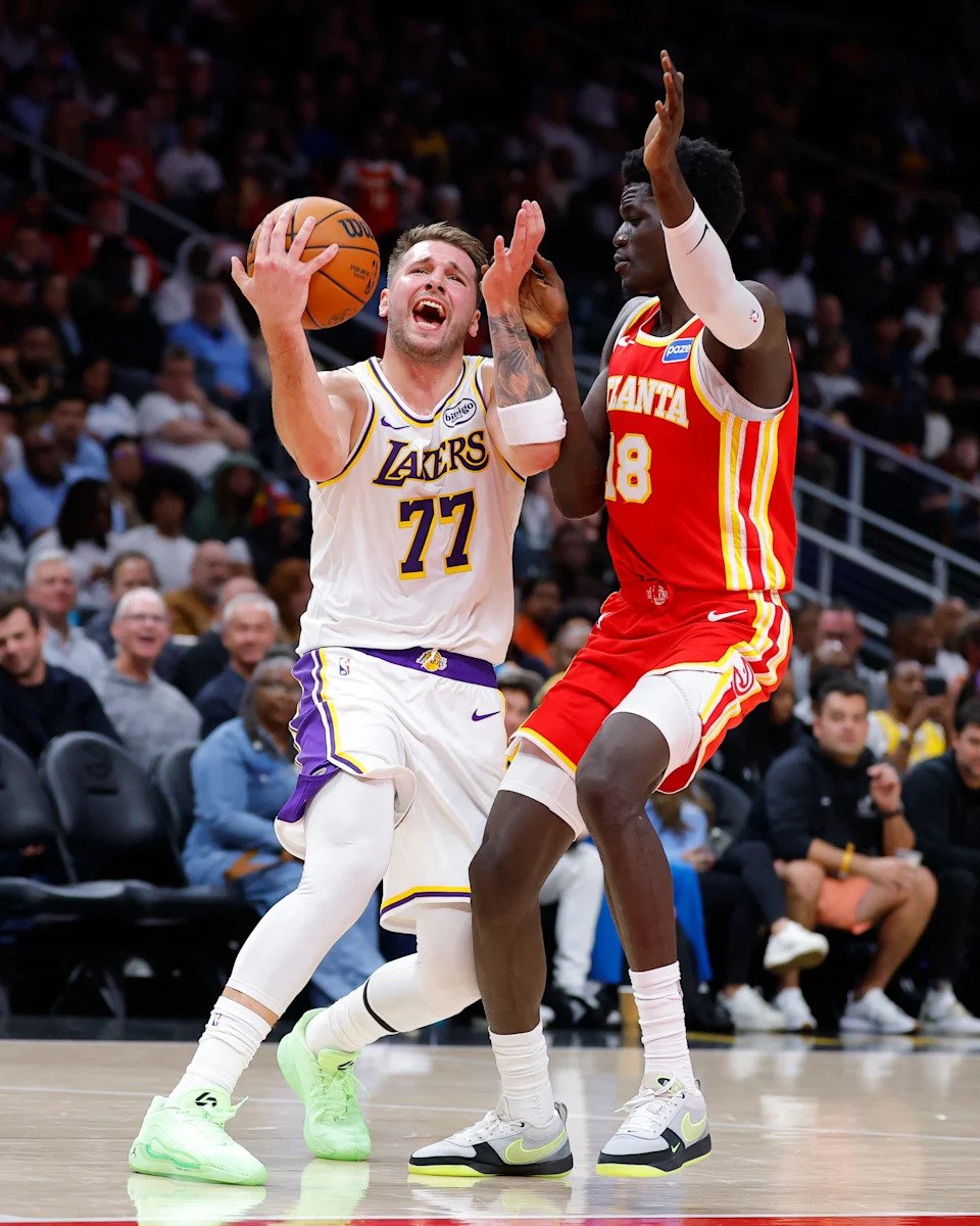 Luka Doncic #77 of the Los Angeles Lakers battles Mouhamed Gueye #18 of the Atlanta Hawks during the first quarter at State Farm Arena on November 8, 2025 in Atlanta, Georgia.