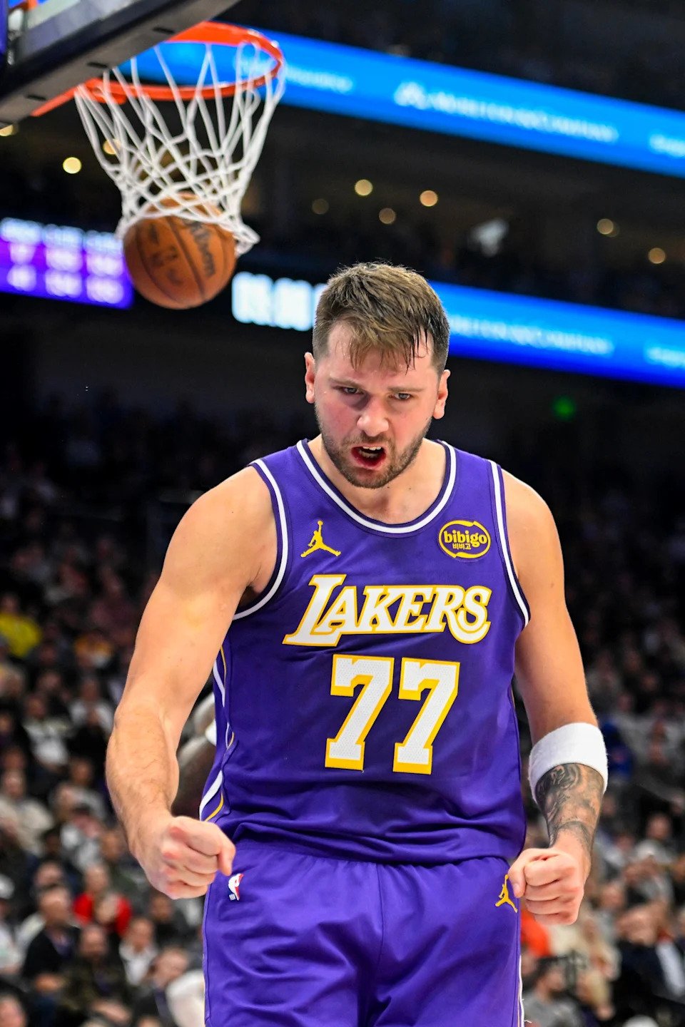 Luka Doncic #77 of the Los Angeles Lakers celebrates a shot during the second half of a game against the Utah Jazz at Delta Center on November 23, 2025 in Salt Lake City, Utah.