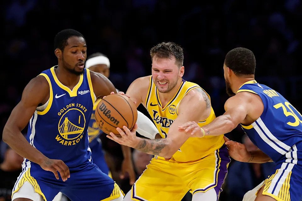 Luka Doncic #77 of the Los Angeles Lakers is trapped by Jonathan Kuminga #1 and Stephen Curry #30 of the Golden State Warriors in the fourth quarter of the game at Crypto.com Arena on October 21, 2025 in Los Angeles, California.