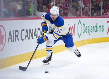 Oct. 9: Buffalo Sabres defenseman Rasmus Dahlin (26) checks New York Rangers left wing Artemi Panarin (10) as he goes after a loose puck during the second period at KeyBank Center.